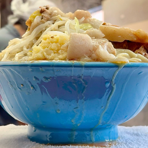 脂たっぷりでしょっぱめ、ゴワゴワ太麺の「ラーメン二郎」の本店。常に行列。無料トッピングとして「ニンニク、ヤサイ、脂、カラメ」があるので、「ニンニク入れますか?」と聞かれたらオーダーを伝える方式。