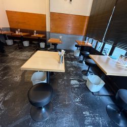 店内は白基調で広々として落ち着いた、今日現在2人掛けテーブル席が7卓ありお水は厨房前セルフ台の上のお水ピッチャーからセルフ(席下に荷物カゴ、左側奥にお手洗いあり)。